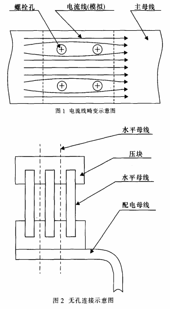 目前,低壓成套開關(guān)設(shè)備母線槽系統(tǒng)的連接主要是利用螺栓連接。螺栓連接在小電流、母線槽數(shù)量不多的情況下具有緊湊、可靠、方便等特點(diǎn);而隨著用電設(shè)備的增加,開關(guān)柜的容量越來越大,用螺栓連接的缺點(diǎn)也日益顯露出來:由于需要在母線槽上鉆螺栓孔,造成母線槽截面不同,必然引起母線槽電流流線的畸變,如圖1所示。所以要求螺栓用孔盡可能的小以盡量減小對電流的影響,但是在配電房里進(jìn)行拼柜的過程中不可避免的存在累積公差,開關(guān)柜的數(shù)量越多累積公差越大,往往造成配電母線槽和主母線槽的螺栓孔產(chǎn)生錯(cuò)位。為了解決螺栓孔錯(cuò)位問題,多數(shù)情況下是采取沖橢圓形孔或沖大孔。這就存在矛盾:螺栓孔開大了,嚴(yán)重影響母排載流量,螺栓孔開小了,安裝不方便。研究新的連接方法成了開關(guān)柜制造商的關(guān)注的焦點(diǎn),無孔連接這種新技術(shù)逐漸成為設(shè)計(jì)人員研究的對象,并且取得一定的成功。目前已有多家廠家研究出形式各異的的無孔連接技術(shù)。筆者也于2001年開始對無孔連接技術(shù)進(jìn)行研究,并設(shè)計(jì)出另一種與眾不同的無孔連接方式,經(jīng)過產(chǎn)品試制和試驗(yàn),證明這種連接方法是行之有效的。