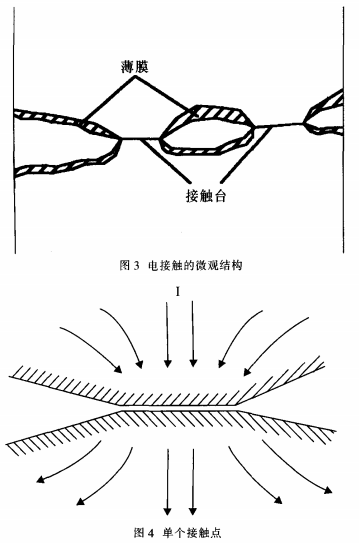 我們知道,在母線槽連接處的電阻,除了母線槽本身存在的電阻外,還存在一個(gè)接觸電阻。這是因?yàn)?不論母線槽表面處理得如何光滑平整,在微觀環(huán)境下,母線槽表面也是凹凸不平的,如圖3所示,兩片母線槽之間的搭接實(shí)際上只有母線槽表面上無數(shù)小尖峰之間的接觸,電流流過搭接面的實(shí)際面積減少了,電流線發(fā)生嚴(yán)重的收縮現(xiàn)象,產(chǎn)生收縮電阻R,取其中一點(diǎn)分析其結(jié)構(gòu)如圖4所示。另一方面,母線槽從加工完畢到裝在開關(guān)柜里有一定的時(shí)間差,很容易因?yàn)楸┞对诳諝饫锒纬梢粚颖∧ぃㄈ缪趸さ?,使電阻增大,稱為膜電阻R,。所以接觸電阻實(shí)際上是由這兩部分組成,即