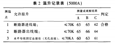 表2是本公司溫升試驗(yàn)室的質(zhì)檢人員按照國家標(biāo)準(zhǔn)GB7251.1-1997的有關(guān)條款對該樣柜進(jìn)行溫升試驗(yàn),對整個(gè)母線槽系統(tǒng)的關(guān)鍵處和搭接面進(jìn)行測量(測得部分溫升記錄)