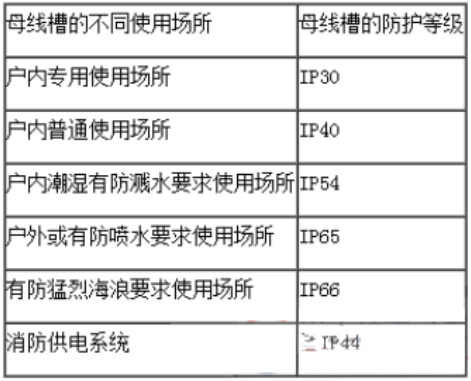 母線槽的防護(hù)等級(jí)應(yīng)根據(jù)不同的使用場(chǎng)所進(jìn)行確定,見(jiàn)表2