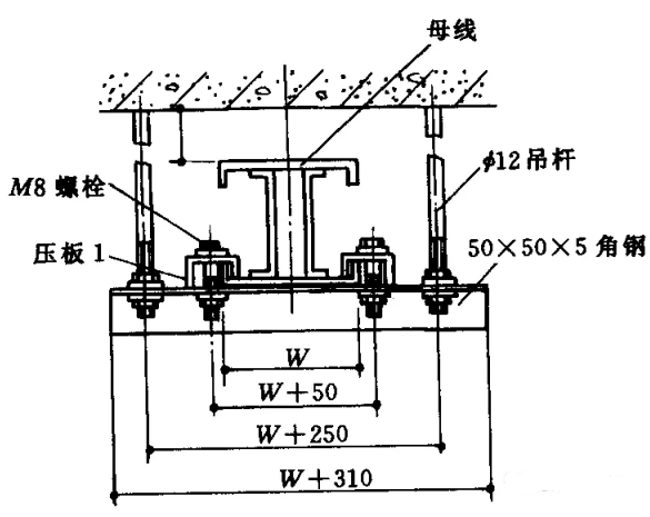 4.3母線槽懸掛吊裝。(圖4、圖5)吊桿直徑應(yīng)與母線槽重量相適應(yīng),螺母應(yīng)能調(diào)節(jié)。
