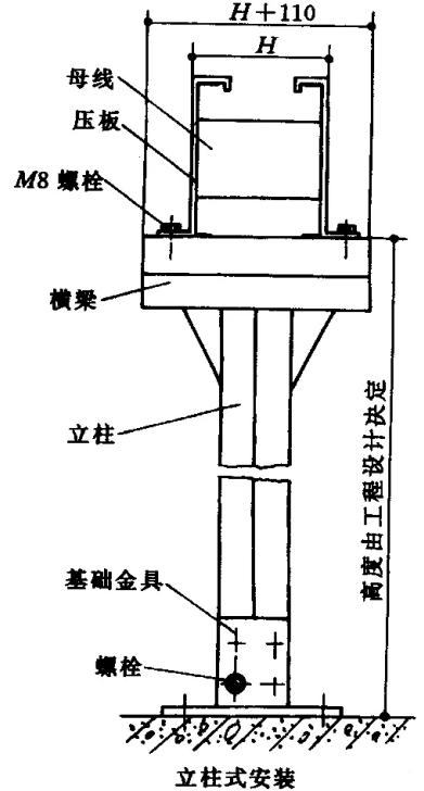 4.4封閉式母線的落地安裝(圖6)。安裝高度應(yīng)按設(shè)計(jì)要求,設(shè)計(jì)無(wú)要求時(shí)應(yīng)符合規(guī)范要求。立柱可采用鋼管或型鋼制作。