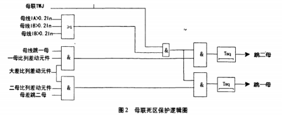 若母聯(lián)開關(guān)和母聯(lián)TA之間發(fā)生故障,斷路器側(cè)母線槽跳開后故障依然存在,正好處于TA側(cè)母線槽小差的死區(qū),為進(jìn)步保護(hù)動(dòng)作速度,本設(shè)備專設(shè)了母聯(lián)死區(qū)保護(hù),其邏輯框圖如圖2。