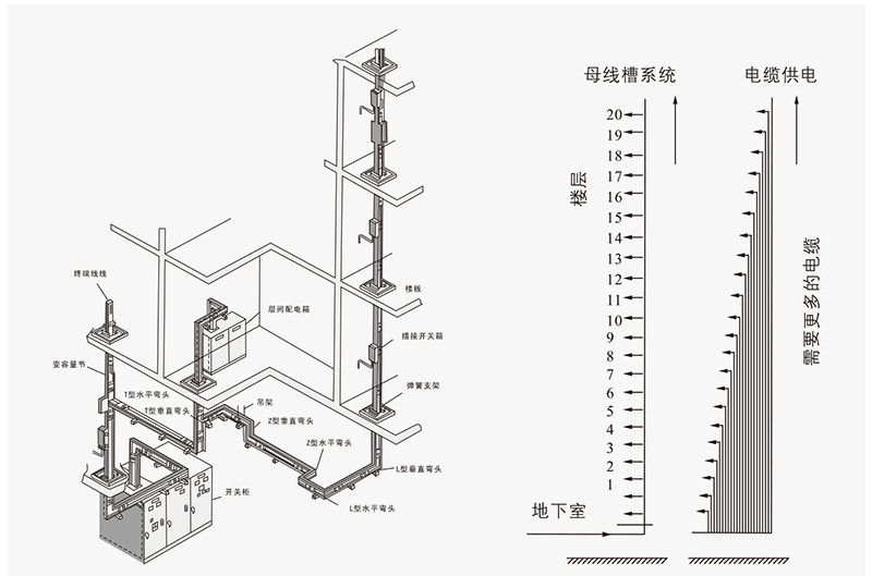 右圖為傳統(tǒng)的電纜供電方法,每層樓面都需要單獨(dú)放線,需要很多電纜。