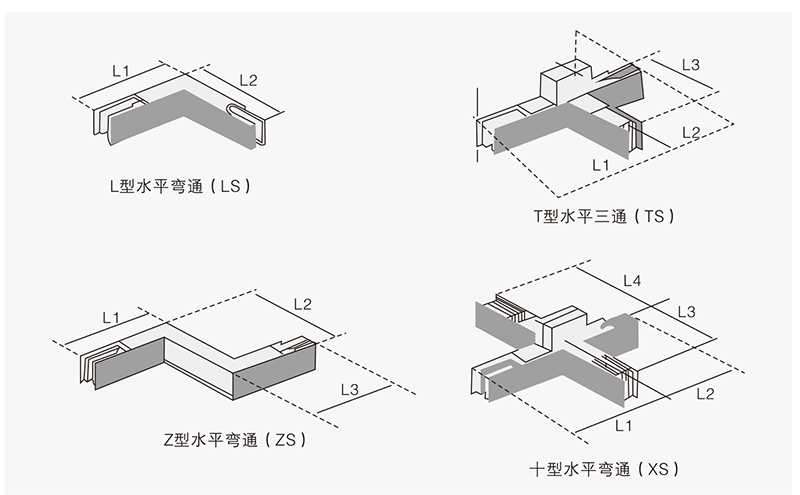 備有供水平及垂直連接的L型、T型、Z型和十字型四類八種,用于水平及垂直配電線的連接及改變母線走向。
